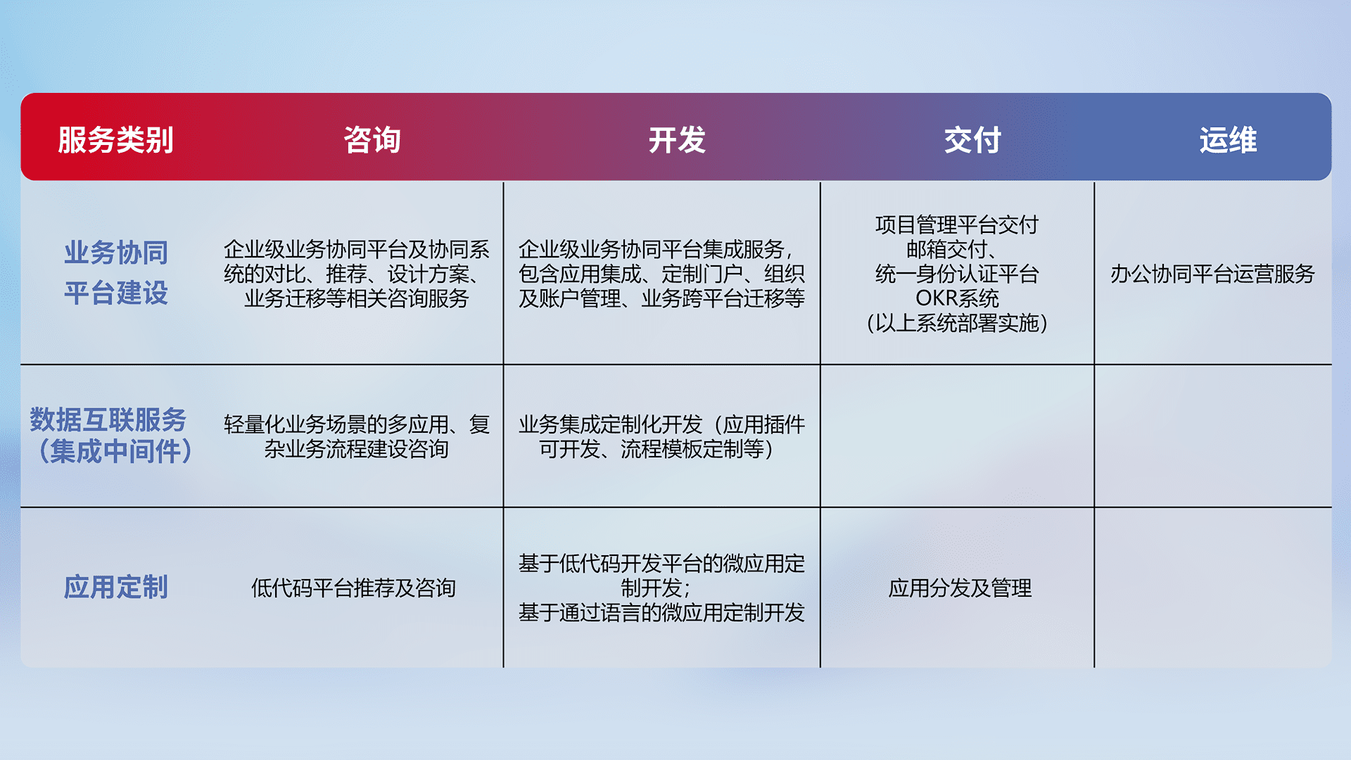 针对钉钉、、、企微、、、IDaas等平台级产品提供产品的规划、、、、方案、、、、交付、、、、定制化开发等服务,,实现如统一协同办公、、、智能客户服务、、、、混合会议管理、、、、智能数据查询、、等业务场景,,,实现数字化转型。。