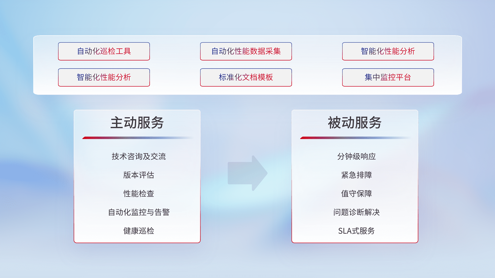 智能化工具和标准化文档,,保障服务质量,,提供主动服务(包含技术咨询、、版本评估、、、、性能检查、、、、自动化监控与告警、、健康巡检)和被动服务包含(分钟级响应、、、紧急排障、、值守保障、、、问题诊断解决、、、、SLA服务)。。